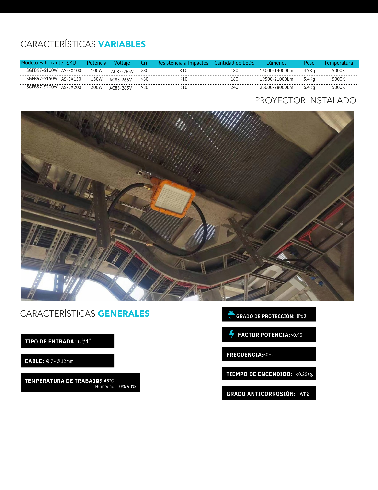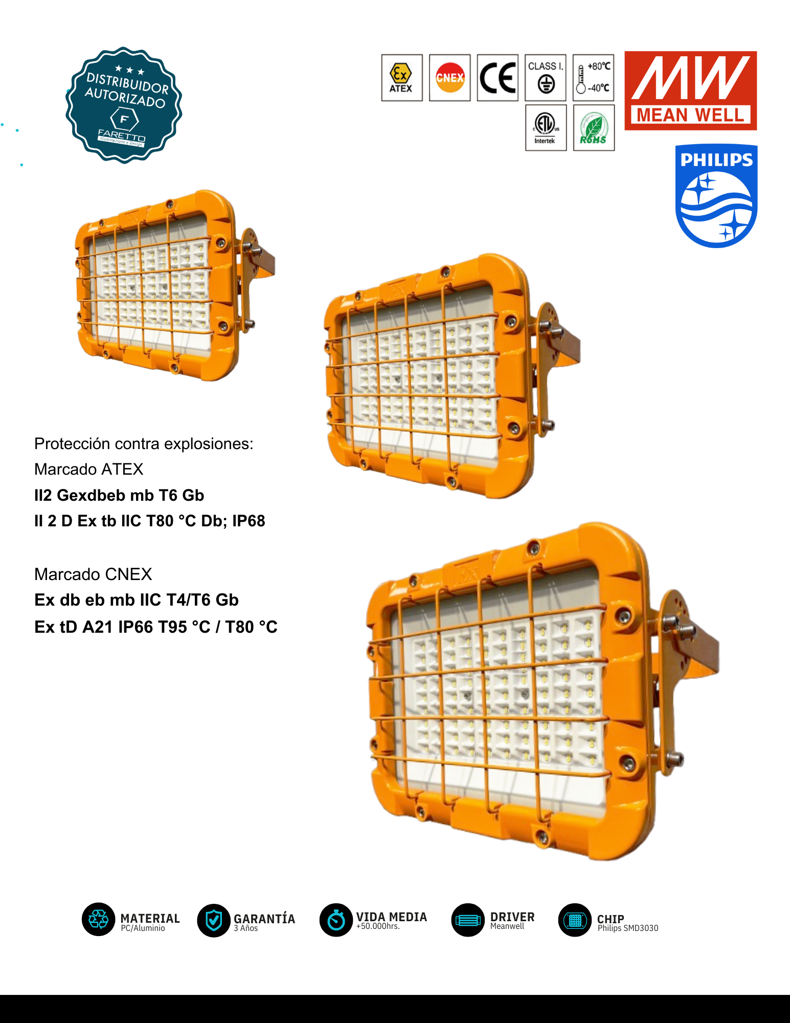 El Proyector LED Antiexplosivo, está diseñado especificamente para operar en entornos industriales peligrosos donde existe riesgo de explosión por la presencia de gases in amables o polvos combustibles. Equipado con tecnología LED de alta e ciencia, este proyector ofrece una iluminación potente, uniforme y de bajo consumo energético. Con una carcasa robusta y sellada IP68, garantiza protección total contra el ingreso de polvo y una resistencia superior a la inmersión temporal en agua. Su diseño antideflagrante y materiales de alta resistencia aseguran un funcionamiento seguro incluso en las condiciones más exigentes. Cuenta con certificación ATEX (Atmosphères Explosibles), lo que lo hace apto para su instalación en zonas clasificadas como Zona 1 y Zona 2 (atmósferas con gases) y/o Zona 21 y Zona 22 (atmósferas con polvo).